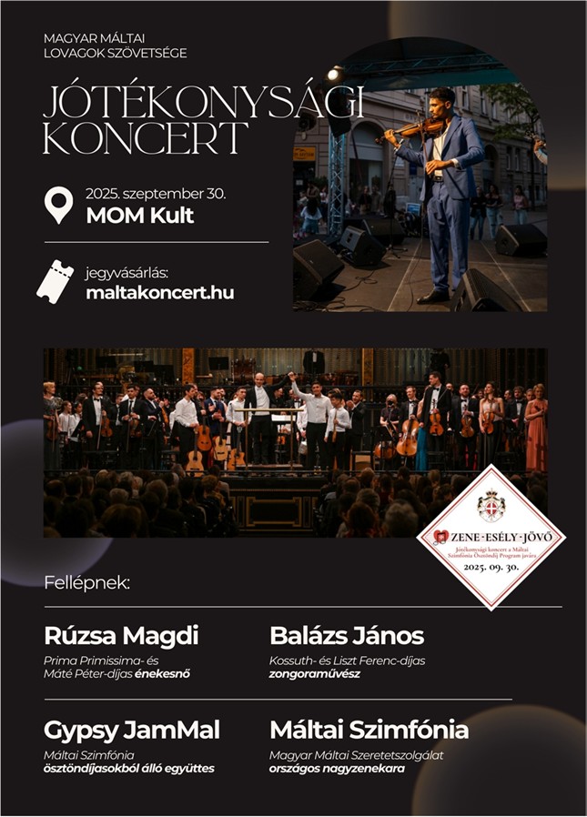 A Magyar Máltai Lovagok Szövetsége tisztelettel és szeretettel meghívja Önt és családját a Máltai Szimfónia Jótékonysági Koncertjére, melynek célja a Máltai Szimfónia Ösztöndíj Programjának támogatása annak érdekében, hogy a zene erején keresztül esélyt teremtsünk és reményteli jövőt építsünk még több nehéz helyzetben lévő, tehetséges fiatal számára.